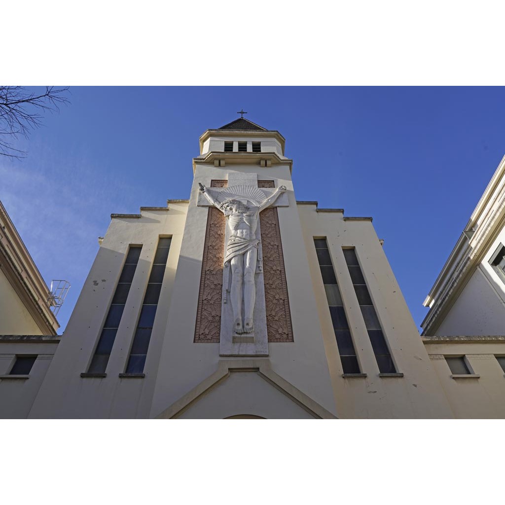 Au 302, le clocher de l'église porte un immense Christ en croix signé L. Bertola.