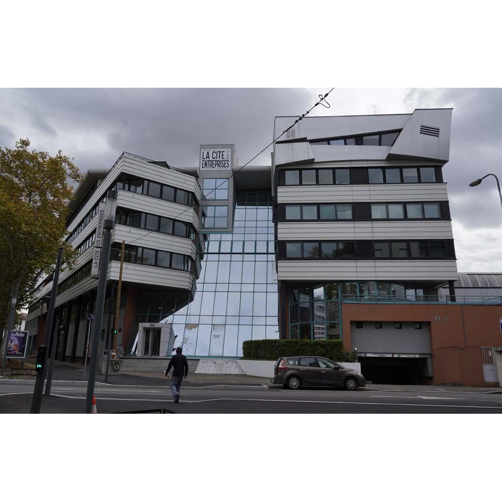 Au 60, la cité des entrepreneurs présente de longues bandes vitrées et métalliques avec un pan incliné sur la rue Morat et deux grands arrondis sur le boulevard Paré. Elle fait face à deux barres d'immeubles en épi.