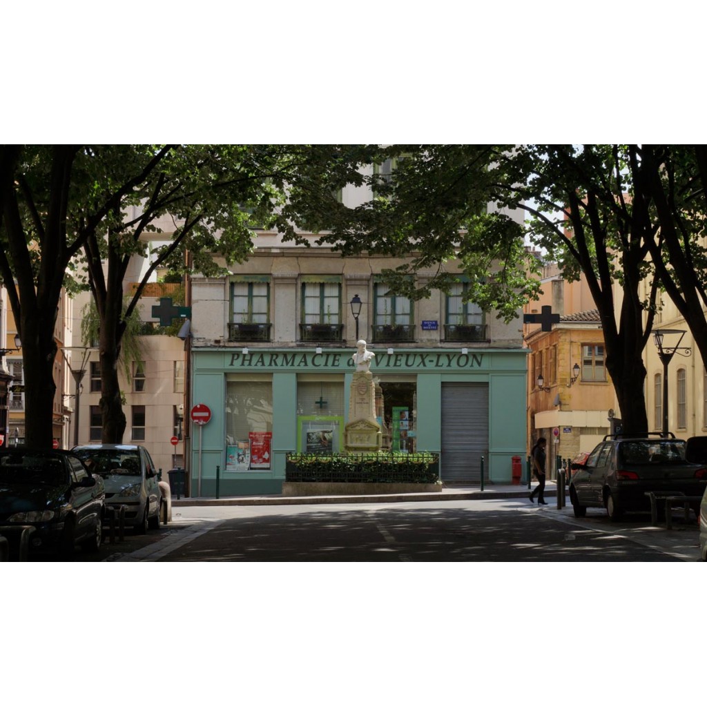 Le trottoir face à l'avenue Max est décoré d'une mosaïque de marbre représentant le vieux Lyon.
