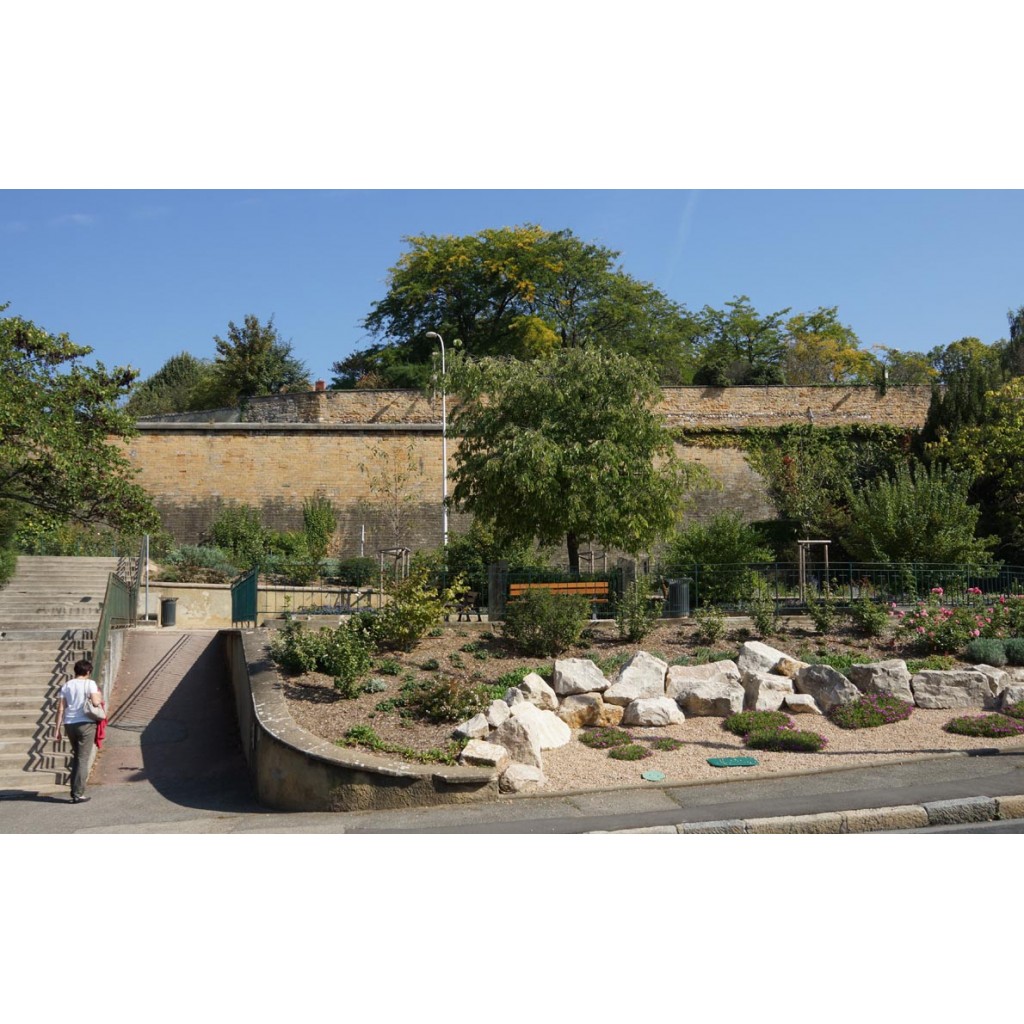Le jardin Francine Chollet occupe l'intérieur des deux lacets en bas de la montée du Cardinal Gerlier en prolongement de la montée de Loyasse.