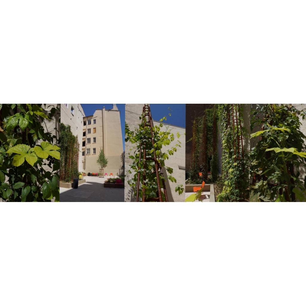 C'est un rectangle dont le sol est largement carrelé. Autour, plusieurs fauteuils métalliques colorés sont fixés au sol ou disposés sur les murs des bacs à plantes qui occupent en partie le tour. Coté rue, les plantes sont basses, au fond, les houblons et autres grimpent sur des structures de fer rouillées dressées le long des murs.