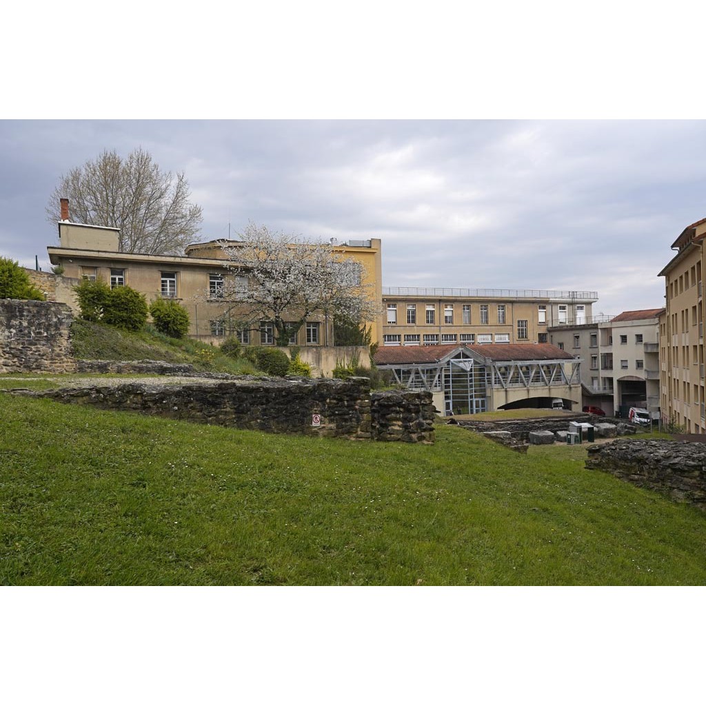 • En descendant, on rencontre de nombreux murs bas, ou plus hauts, certains en partie couverts, départs de souterrains, vestiges d'un quartier antique de Lugdunum. Le quartier continuait sous le terrain du lycée en direction des théâtres romains une bonne centaine de mètres plus au nord.