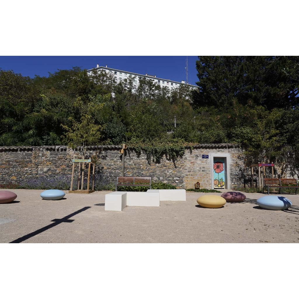 C'est un petit jardin sur une légère butte, il est adossé à un ancien mur qui le sépare du terrain de sport de Trion et de la colline avec le Bastion en haut, la balme donne une ambiance verdoyante. Des petits talus le séparent de la chaussée, on y accède par des escaliers. Cinq jeunes arbres lui donneront de l'ombre, leurs protections incitent à vivre et à sourire.