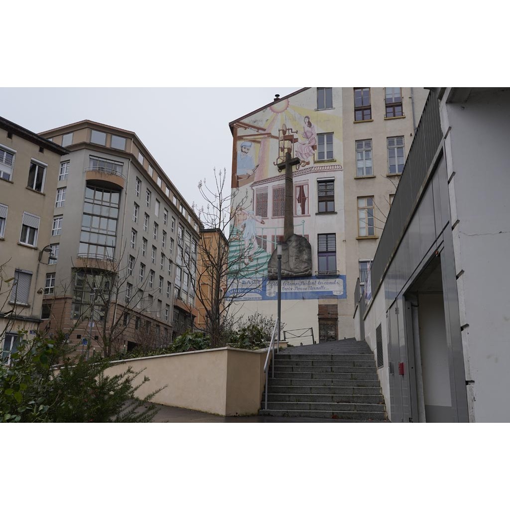 Coté sud, une immense croix occupe un mur aveugle de la rue Kubler peint de trois figures de travailleurs de la soie, on peut imaginer que la femme en haut ressemble à Victorine Chavet. Elle porte le nom du façadier Bact et la devise, file le temps, restent les canuts, Croix Rousse éternelle.