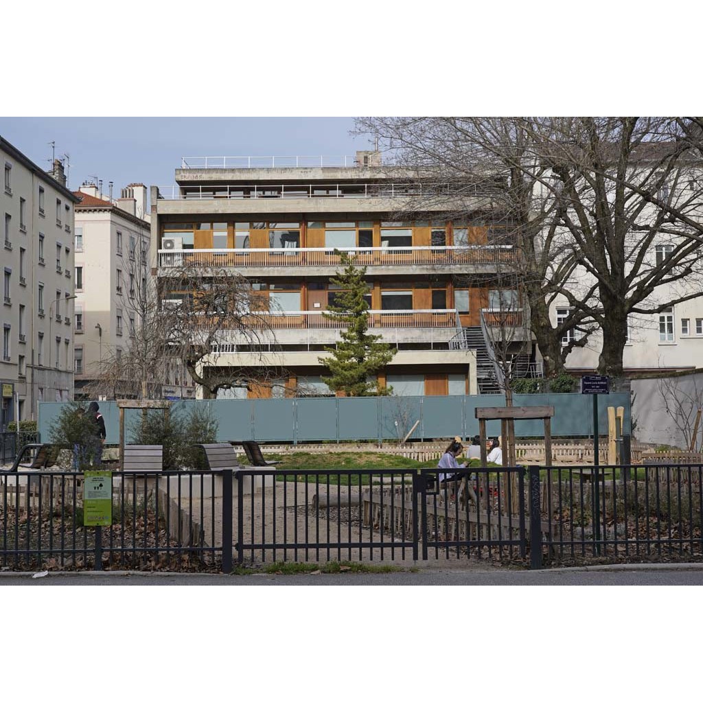 Le square Lucie Aubrac occupe l'angle de l'avenue Berthelot et de la rue Bancel.