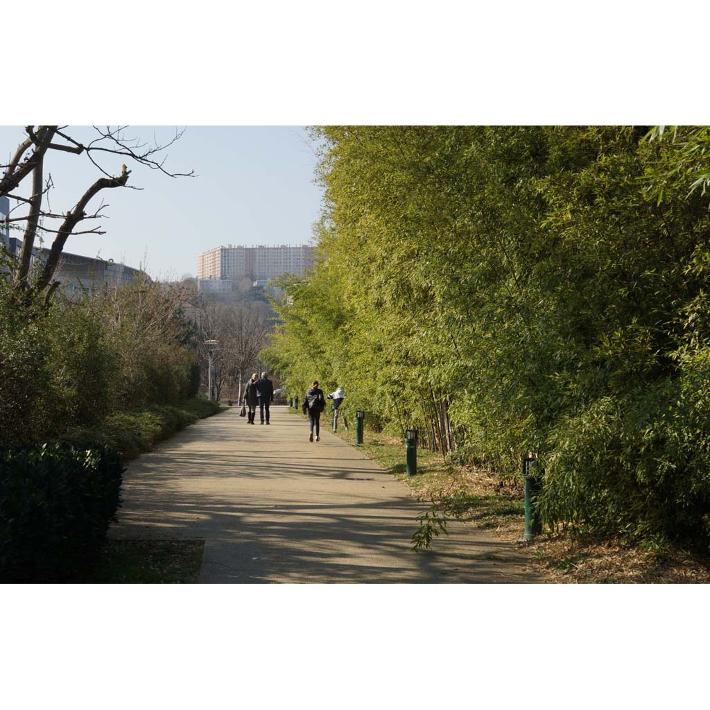 A l'ouest, l'allée passe entre des buis et des joncs qui cachent la façade sud de la halle Tony Garnier et le flanc miroir impressionnant d'où dépasse une enseigne au lion.
