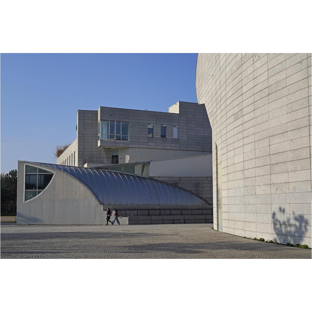 La bibliothèque est plus simple, posée au-dessus d'une large montée d'escalier qui renforce le triangle de la place, c'est une longue barre dotée d'une immense marquise ronde pour en protéger l'entrée.