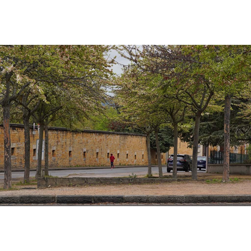 La place est dessinée par un angle des fortifications de Lyon, leur dernière mouture date des années 1830, reconverties en mur d’enceinte des cimetières, elles n’ont pas été démolies.