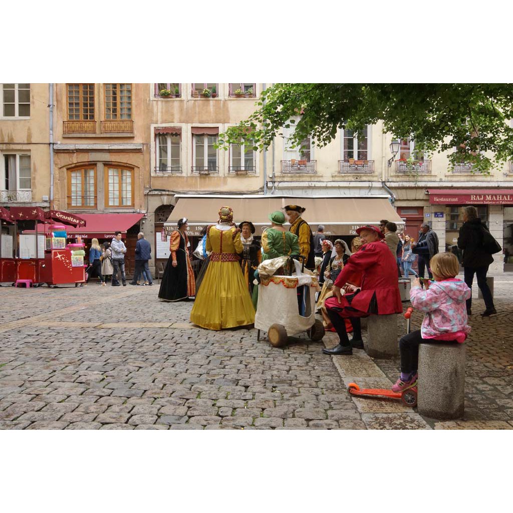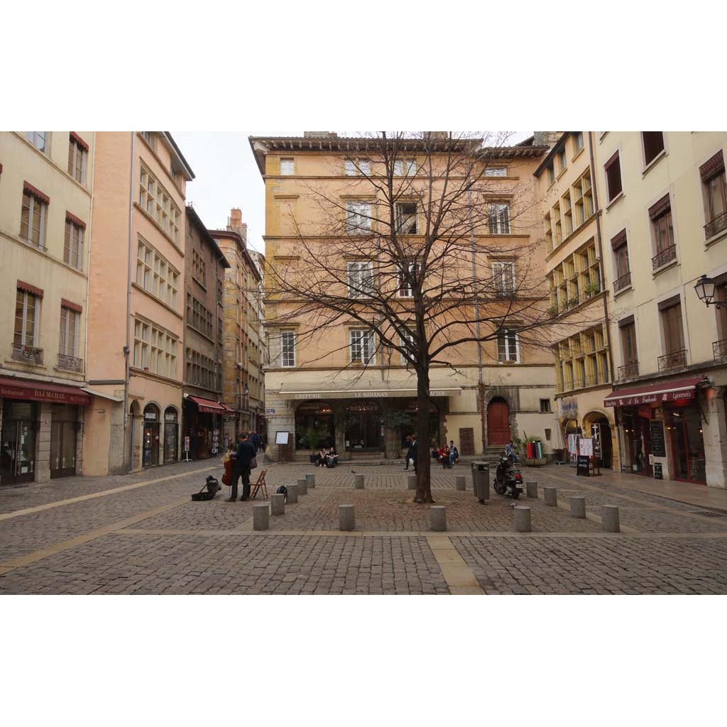 C’est une belle place du Vieux Lyon, tous les bâtiments sont anciens, quatre étages et tous différents. Ils sont ouverts par de belles portes avec encadrements de pierres.