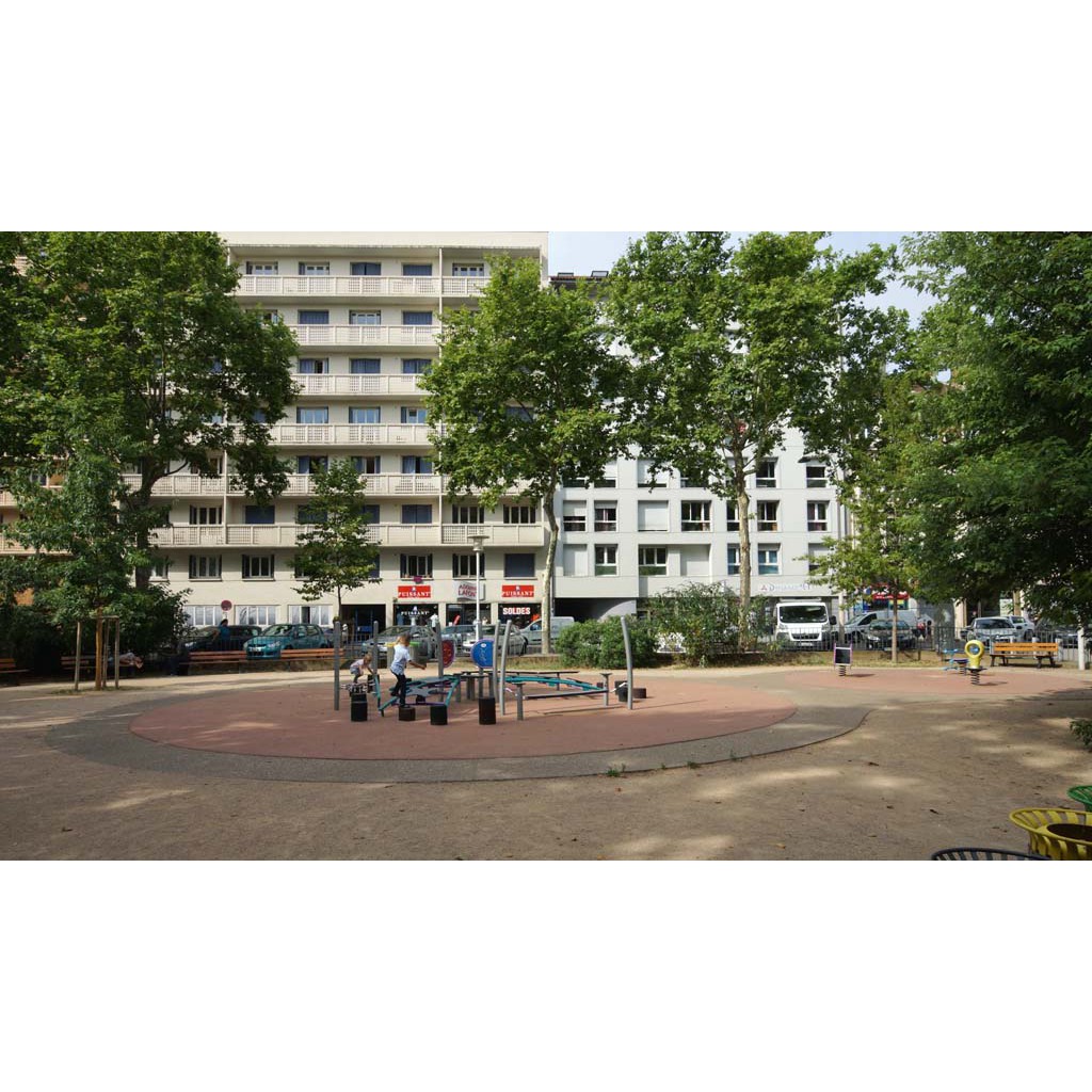 Le triangle central, réservé aux piétons est entouré de platanes, encore plus au centre, un petit triangle est à nouveau entouré de platanes, il est en terre battue, une dizaine de bancs regardent en direction des jeux d’enfants.