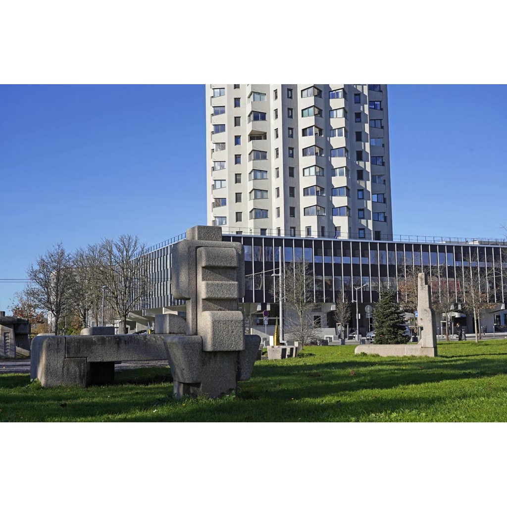 La fontaine de neuf pierres de granit évoque l’histoire de l’humanité, elle a été installée en 1997. Elle fait penser à une sorte de Stonehenge installé pour donner du travail à de futurs archéologues et historiens des croyances. Il y a de nombreuses gravures à déchiffrer, pour en rester à l’histoire locale, j’y ai repéré le nom de l’un de nos deux fondateurs mythiques Atepomoros et celui de notre fondateur historique Plancus.