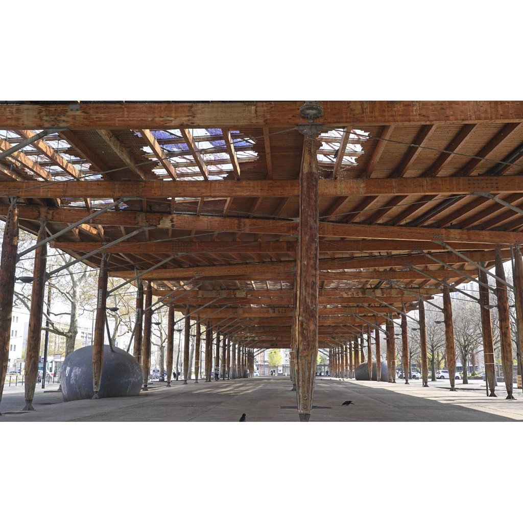 C'est un immense rectangle vide tenu par trois rangées de troncs taillés enserrés dans des amarres de métal arrimées à de gros blocs de béton qui stabilisent l'ensemble. Ils soutiennent une grande charpente de bois.
