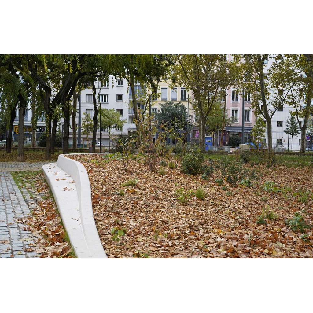 La place publique est parcourue par plusieurs allées qui délimitent des massifs de végétaux. Le principal est limité vers le centre par un immense banc courbe au sud de la rue Paul Bert entre la rue Garibaldi et la rue Jouhaux.