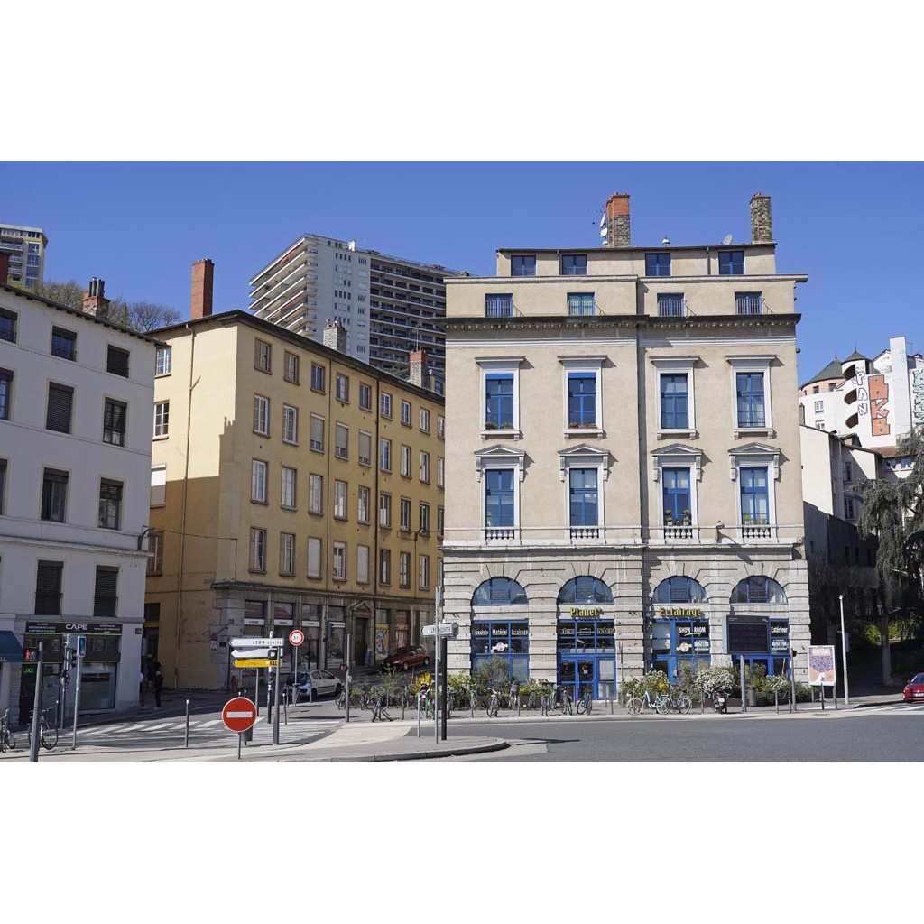 Les commerces sont, la maison de Titi qui vend des articles de fête, Lyon spa et l'atelier du meuble peint. En 2026, un vendeur de matériel d'éclairage et un autre d'électricité. La photo de Arnaud Pierre JL de photographes en Rhône Alpes montre la place en octobre 1993, le bar le Churchill est toujours là en 2026.