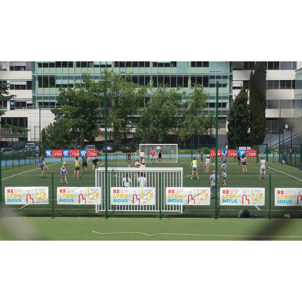 Ensuite, c’est le grand terrain de foot entouré d’une piste d’athlétisme du stade Boucaud, deux mètres en contrebas, protégé par une grille. Il dispose de petites installations le long de la rue Rhin et Danube et de plus importantes, neuves le long du quai de la Gare d’Eau.