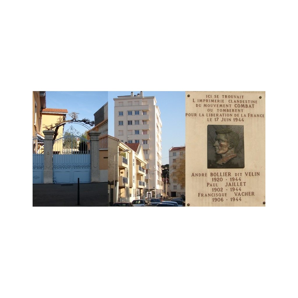 - Le 17 juin 1944, André Bollier a été tué par la milice de Paul Touvier avec deux camarades, Paul Jaillet et Francisque Vacher dans son atelier où il imprimait les journaux de la résistance, Action, Combat, la Marseillaise et Libération. On peut voir leur presse et lire cette histoire au CHRD, avenue Berthelot. Une plaque en indique l'emplacement après la rue Farrère sur un immeuble construit depuis.