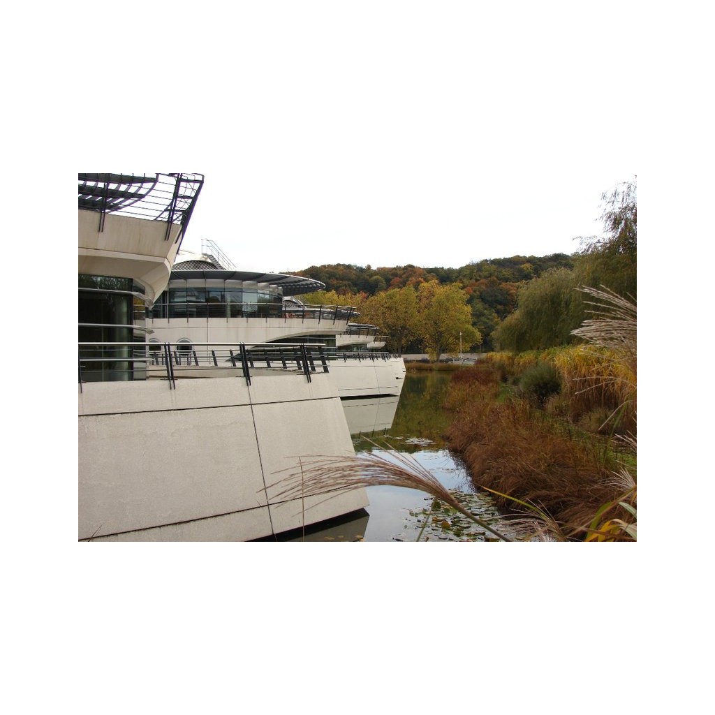 Des bancs permettent de s’asseoir et d’écouter l’eau s’écouler dans la douve en partie masquée par les joncs qui laissent deviner les proues blanches des incroyables fausses embarcations Atari construites alignées comme un convoi fluvial suivant la rivière.