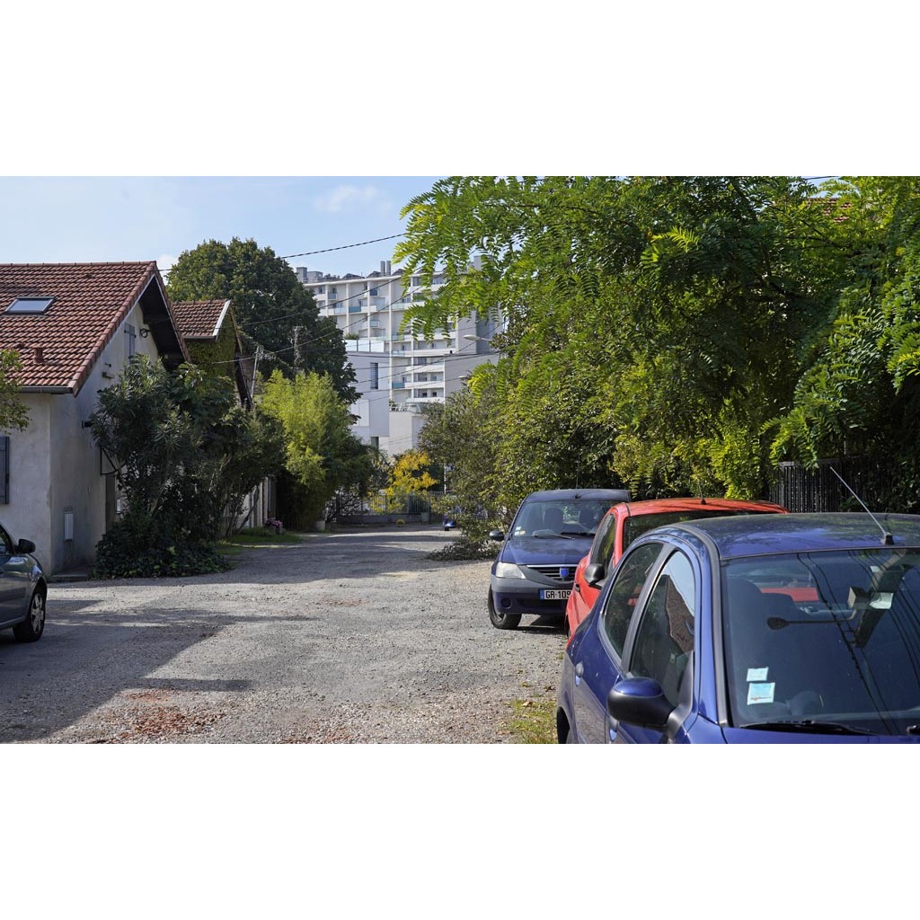 Une allée donne accès à un groupe de garages.