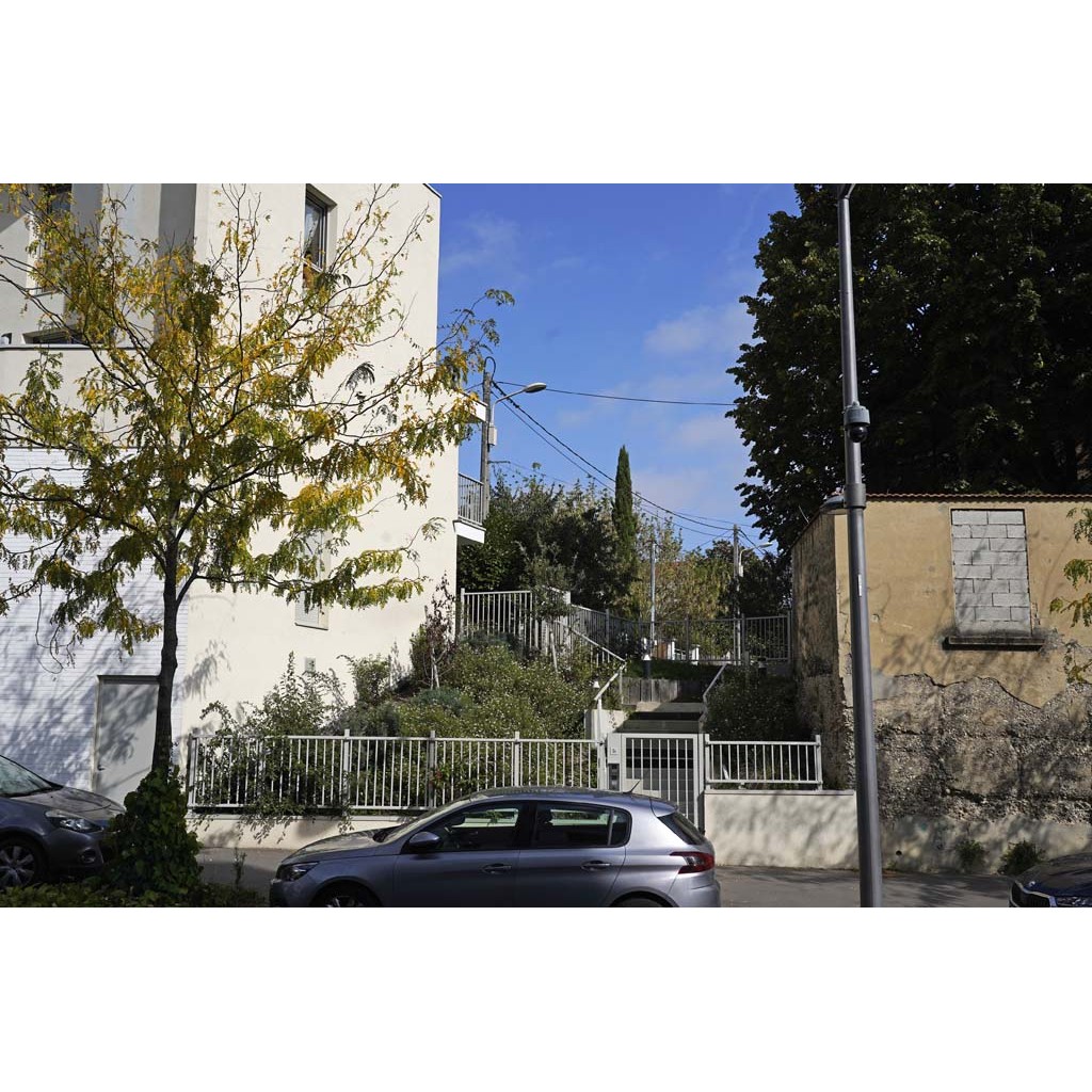 - En 2025, deux barrières bloquent le passage en haut et en bas de l'escalier rue Ranvier qui semble dépendre de Alba, un immeuble récent 39 rue Ranvier, un autre immeuble récent fait l'angle sud avec le boulevard Pinel.