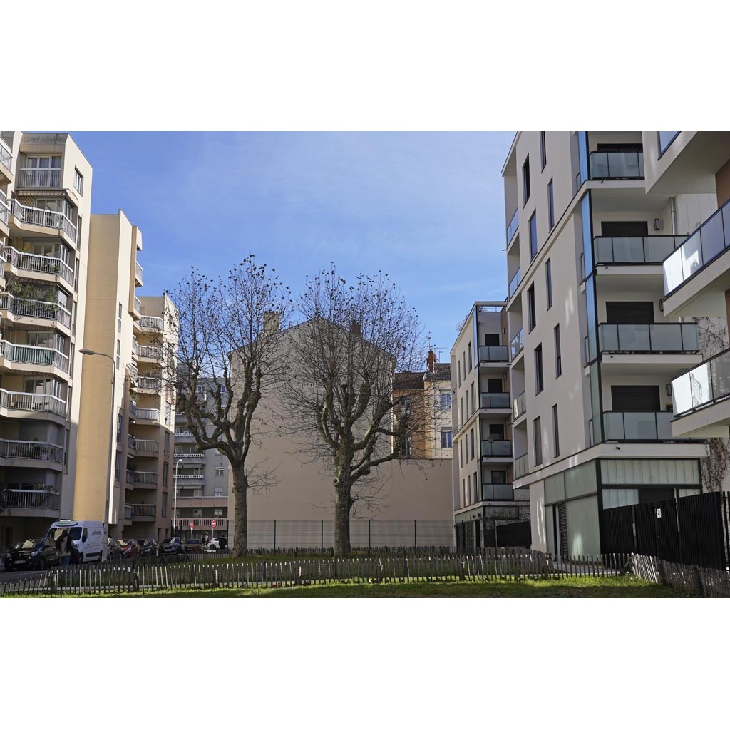 Après la rue Saint Gervais, le coté sud est construit loin en retrait de parkings, il y a une maison et deux barres dont la première est datée 1979. Au nord, c'est une alternance d'immeubles, de maisons et d'ateliers. Les maisons paraissent minuscules entre les grands immeubles.