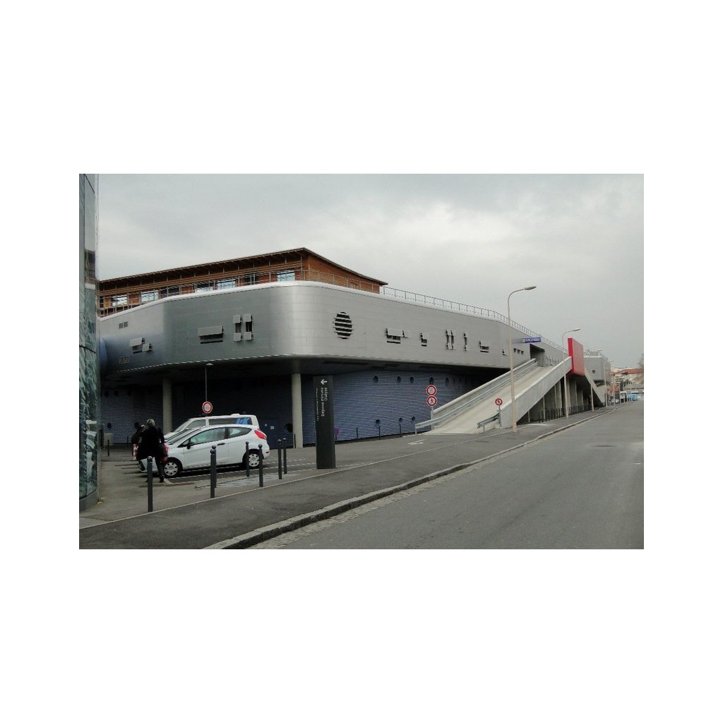 La partie principale longe l'hôpital Mermoz à l'ouest, d'abord son parking, puis une barre aux murs obliques dallés de pierre avec un second étage en bois puis le grand bâtiment couvert de zinc avec sa double rampe qui monte les ambulances jusqu'à l'entrée urgences à l'étage, puis le dernier, arrondi sur l'avenue Mermoz, couvert de verre décoré.