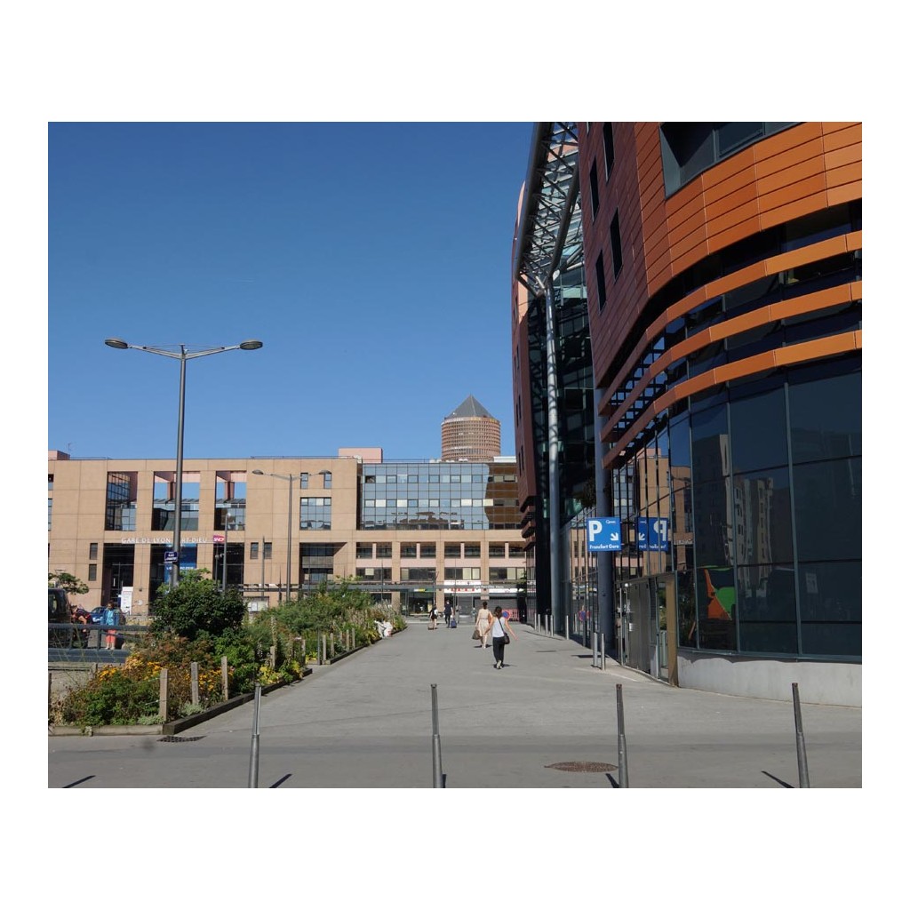 Coté nord, l'immeuble Terra Mundi appartient à la place, il est fait d'une architecture en creux qui unit deux boules oranges arrondies sur les rues Villette et Flandrin.