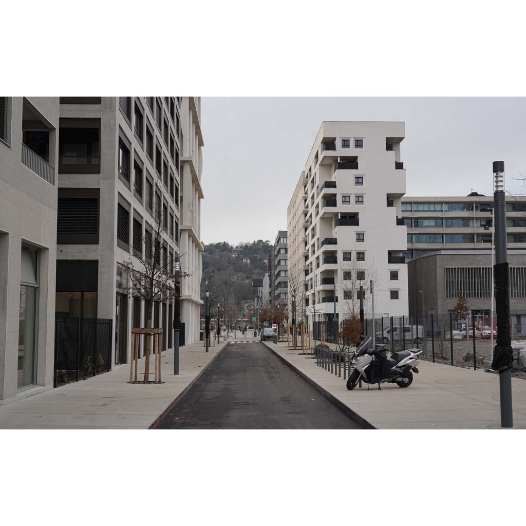 La rue Baudelaire fait partie d'un alignement avec le quai Riboud et le nord de la place Mitterrand.