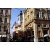 La rue se termine avec l'aile majestueuse en pierre de taille du palais Saint Pierre où une tête au masque fait face à celles qui ornent la façade sud.