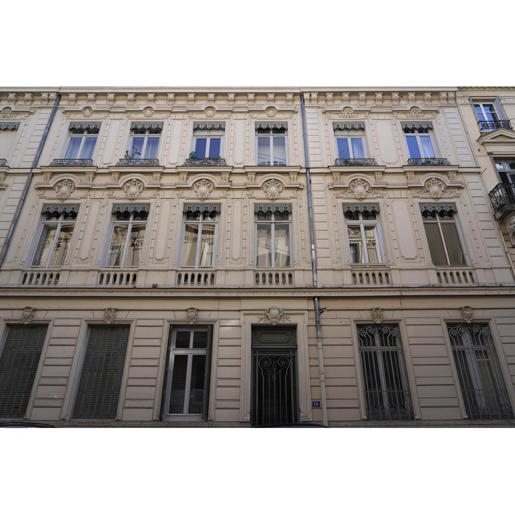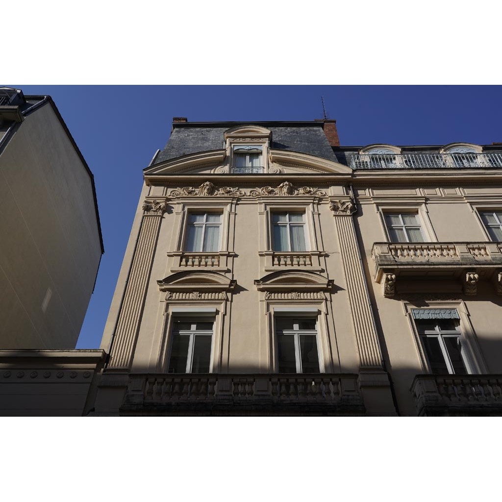 Avant la rue Godefroy, deux immeubles du 19e siècle en pierres, au nord, les grandes fenêtres à chapiteaux d'un hôtel particulier de la rue Godefroy.