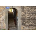 Un escalier grimpe de la Boucle sous un court et étroit tunnel pratiqué dans un gros mur de pierres sous une bicoque.